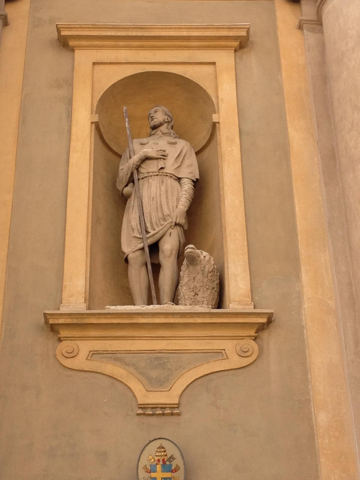 Кафе МЕРКАНТИ с фигурами римского поэта Авзония и Святого Амвросия на уровне второго этажа здания