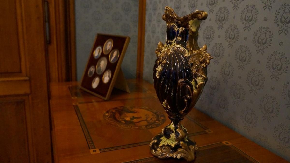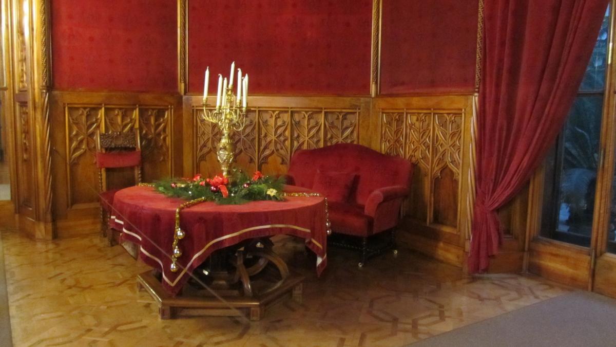 Перед нами деревянная резная лестница, которая поражает воображение своей красотой и которая ведет на верхние этажи, но наша экскурсия будет проходить по парадным гостиным замка на первом этаже. На втором этаже замка располагались покои хозяев, а на третьем были комнаты детей и комнаты гувернанток. Мы идем по комнатам замка.