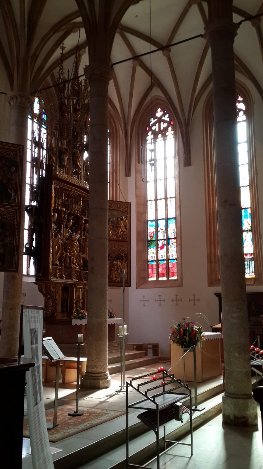 В этой церкви два алтаря. Когда по распоряжению папы Римского готические алтари в католических храмах меняли на барочные, в этой церкви рушить старый алтарь не стали, прекрасную работу Михаэля Пахера решено было сохранить.