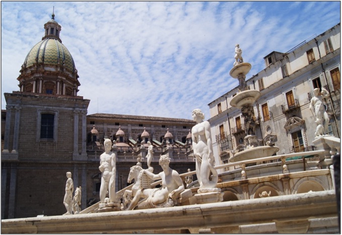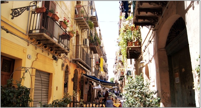 Надо сказать, что центральный Палермо (не криминальные трущобы) производит весьма добропорядочное впечатление. В архитектуре самых простых жилых домов чувствуется неуловимый «дух Италии». Может, это не так ярко выражено, как в Риме, но, тем не менее ощущается явственно: большие окна с деревянными жалюзи, закрытыми от солнца, утопающие в цветах балконы с гнутыми перилами, немного потрескавшиеся жёлто-апельсиновые, стены…