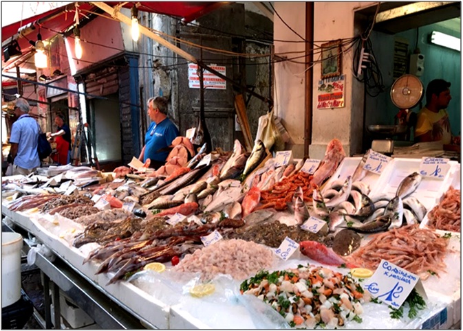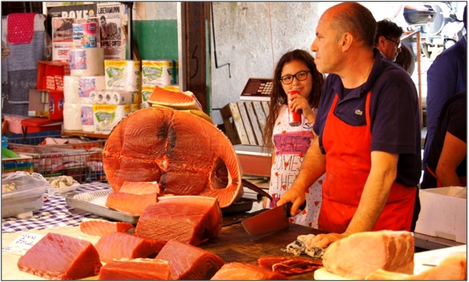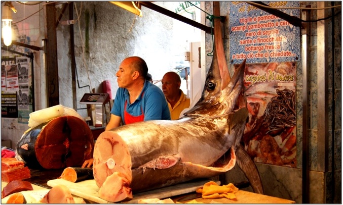Отдельная тема (даже не тема, а песня) – это рыбные ряды. Главный рыбный рынок Палермо находится не здесь, а ближе к гавани. Но даже то, что увидели мы здесь, вдохновило. Особенно не давали покоя две мысли, постоянно прокручивавшихся в голове. Первая: вчера это всё плескалось в море, а что-то  и пару часов назад. Вторая: если ЭТО осталось к закрытию рынка, то что здесь было с утра, когда улов только-только доставили с моря? Конечно, больше всего поразили туши тунцов с их пунцовой мякотью. Подвешенные за голову рыбы – меч тоже не отставали от них по размерам. Вместо запахов, которые по европейской традиции отсутствуют на рыбных рынках, голову нам кружили цены: килограмм свежайшей тунцовой мякоти всего за … 10 евро. Кстати, если прийти на рынок пораньше, то можно увидеть как эти субмарины разделывают.