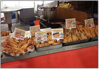 Коли к слову пришлась картошка, то нужно отметить такое явление, как «уличная еда» на Меркато дель Капо. Еду здесь продают в крохотных кафешках, с прилавков и развозят на тележках. Основной ассортимент – рыба и морепродукты (преимущественно в кляре), гриль-овощи и итальянские аналоги гамбургеров. Еда эта популярна как у местных торговцев, так и у многочисленных туристов-зевак. Порции совсем не детские – хватит, чтобы наесться человеку, целый день разгружающему ящики с рыбой. Чтобы не быть голословным, слазил в интернет по ссылкам  «Меркато дель Капо, Палермо» (сам я беспокоить едоков не решился).