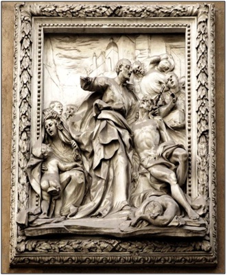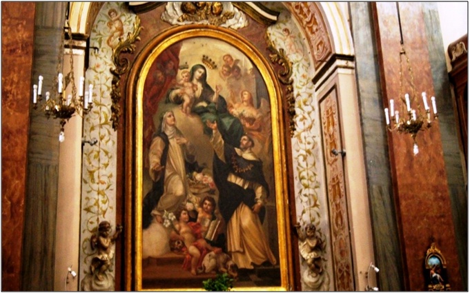 Главный алтарь посвящён Богородице. Справа от него – Моисей со скрижалями заповедей. Здесь он уже не рогатый, как на фонтане в Риме, но сияние исходит, опять-таки, парой лучей.