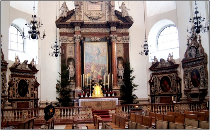 Опубликовано 11 марта, 20187 г. Автор comment_714082 Внутри собор огромен и роскошен – в нем установлено 11 алтарей и 5 органов. В оформлении использован розовый гранит и чёрный мрамор – всё очень сдержанно, гармонично и изящно. По случаю адвента, на главном алтаре открыта картина итальянского мастера «Вознесение Христа» (в обычные дни её скрывает занавес). Путеводители приписывают её флорентийцу Масканьи, но на запрос интернет выдаёт справку только о Пьетро Масканьи, композиторе. Сейчас алтарь обрамляют рождественские ели, украшенные вифлеемскими звёздами и праздничными огнями. Впрочем, ели стоят и у других алтарей. Одним из украшений интерьера являются резные надгробия зальцбургских архиепископов, чудом уцелевшие при бомбардировке. Особую известность собору принесли его пять органов: четыре из них (малых) окружают средокрестие (место под главным куполом), а главный, насчитывающий около 4000 труб, расположен напротив алтаря. Провидению было угодно, чтобы под звучание этих труб в соборе крестили мальчика, которого впоследствии весь мир узнал как Вольфганга Амадея Моцарта. Пройдёт совсем немного лет и юный гений будет играть на этом органе, а впоследствии даже напишет несколько хоралов для собора. Кстати, купель, в которой крестили Вольфи, сохранилась, хотя изготовлена она была ещё в XIV веке. В крипте собора находятся захоронения архиепископов Зальцбурга и городской знати. По тем временам это могли позволить только для о-о-чень состоятельных усопших. Это обстоятельство и стало причиной того, что могила Моцарта утеряна. Вопреки распространённому мнению, композитора похоронили вовсе не в мешке, в братской могиле вместе с бедняками, как это снял Форман в своём «Амадеусе». Похороны Моцарта проходили по третьему разряду, что предусматривало погребение в гробу, но в общей могиле вместе с 5—6 другими гробами. Это вовсе не были «похороны нищего», просто таковы были нравы того времени – отдельная могила с надгробием полагалась только богатым или представителям знати. Остальные могилы оставались необозначенными, надгробные камни разрешалось ставить не на месте самого захоронения, а у стены кладбища. Озадачил «театр теней», обустроенный в той же крипте. Что за странная прихоть? Были и другие необычные изображения, правда не столь «экзотические»: монарх (или епископ?), отрезающий полу мантии, чтобы укрыть нищего, Иезулатка в праздничных одеждах, столь часто встречающийся в той же Праге. Провожал нас грустный путти, кутаясь в какую-то ветошь (может быть, в ту самую полу мантии). Теперь перед нами встал выбор: или сходить ещё куда-нибудь, а потом дробной рысью нестись на другой берег Зальцаха под урчание голодного желудка (там нас ждёт автобус) или зайти пообедать, а потом не спеша проследовать на стоянку, по пути отмечая места, куда хотели бы попасть, но не смогли. По крайней мере, я с большим интересом вновь посетил бы Францисканеркирхе с домиком внутри для Саломеи Альт (была и такая причуда у Райтенау) или в аббатство Святого Петра, самый первый монастырь в Зальцбурге (основанный ещё Св.Рупертом) с могилой Михаэля Гайдна. Или… да мало ли куда можно сходить в таком городе как Зальцбург! Выбираем второй вариант: надеемся, что в следующий приезд нам со временем повезёт больше. Особенную досаду вызывает то обстоятельство, что сегодня в Зальцбурге светит 