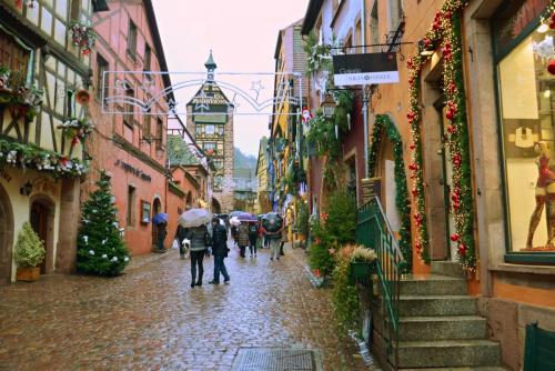 Опубликовано 27 апреля, 20187 г. Автор comment_720610 До Риквира всего 70 километров, первый такой короткий переезд в этом туре. И ни одного километра из этих семидесяти я не жалел, что потратил такое драгоценное свободное время в Страсбурге на повторение уже пройденных ранее маршрутов. Это тот самый случай, когда встреча со старым знакомым принесла спокойную радость. А новое - еще увидим; двадцать лет спустя, десять лет спустя... Мимо автобусных окон мелькают указатели: Оберне, Селеста, Рибовилле... Подумать только, меньше месяца назад я уже был здесь, проезжал по этой дороге, и - вот опять. Старые названия узнаются даже во французском начертании, то, что Riquewihr - это и есть Риквир, требует осознания. В городок под таким адаптированным к русскому языку названием мы приехали, чтобы насладиться эльзасскими винами. А перед этим полюбоваться на его единственную улицу, вот она, слева, носит гордое имя Де Голля. Вообще-то, деревушкой это поселение было бы назвать более солидно, ибо как деревня оно известно почти тысячу лет. А в статусе города - даже немножко менее семисот. Виноделие - главное занятие населения. После туристского бизнеса, конечно. Но виноделие было первым, и фирменные винные магазинчики с забавными вывесками встречаются на каждом шагу. Дождь из сильного перешел в ливневый. Поэтому знакомство с городом превратилось в кросс в обстановке, приближенной к боевой. Следуя за Анной, на ходу примечаем Мулен Руж (кто вообще сказал, что это в Париже?), множество приветливых подвальчиков с предложением дегустации и приобретения местных вин. Не знаю, что снимал этот соотечественник, но группа уже убежала далеко, а я все не мог сконцентрироваться на ценнике. Возле следующего подвальчика, к счастью, никого. Улицы все еще по Рождественски нарядны. Глотаю слюну при виде витрин. Ладно - вино, ладно - сыр и колбаса, пусть foie gras. Но "Baeckoffe" в банках! Сразу вспомнились наши такие советские, такие пищекомбинатовские солянки-рассольники-борщи! Разогрей и съешь! Еще один магазин игрушек. Заходить не будем, но у меня предчувствие, что я его где-то видел. Городская эстрада пуста, мы опять опоздали на шоу. А так хочется послушать рождественский детский хор. Между прочим, существо, венчающее фонтан, при жизни числилось львом. Но скульптору надо все же реже посещать дегустации или поплотнее закусывать. Могу порекомендовать уютный дворик с притаившимися двумя мадам - с сыром и колбасой. Им, конечно, сухо под навесом, но очень одиноко - покупателей не видно. Надо торговым работникам все-таки поближе к народу быть. А вот эту башню я знаю - это ведь вокруг нее происходит действие в четвертой серии "Десятого королевства". А в комнате под часами Охотник хранил волшебное зеркало. Вот и магазин рождественских игрушек обрел свое место - даже табличка с указателем улицы та же. Это возле него хроническому неудачнику Тони Льюису, это самое зеркало разбившему, прилетела с неба очередная неприятность в виде камня или метеорита. Кто бы мог подумать, что этот огромный населенный пункт, который мы прошли насквозь за 15 минут, окружен двойным кольцом стен, и воротная некогда башня с часами теперь оказалась в середине городка. А это - уже внешняя стена, и перед ней когда-то был глубокий ров. Разрисованные домики с неубранными пока что рождественскими украшениями и часто имеющие собственные названия, о