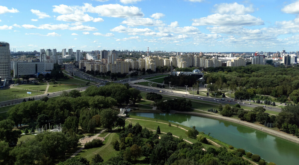 Опубликовано 18 декабря, 20187 г. Автор comment_747530 Минск. От бани до библиотеки. Часть 4 Наш дальнейший путь пролегал по берегу Свислочи в направлении гостиницы «Беларусь» – именно там находится, на мой взгляд, одна из самых лучших смотровых площадок Минска. Дошли мы туда довольно быстро, по пути заглянув к Пушкину – тому самому Александру Сергеевичу, который наше всё! Огромный сквер соблазнял прогулкой, но мы благоразумно решили отложить её на потом и отправились к гостинице. Смотровая площадка находится на крыше и попасть туда просто так не получится. Если бы я заранее не прочитала в Интернете что и где, то вряд ли догадалась бы, хотя… В общем, порядок действий следующий: 1) нужно подойти на ресепшн и озвучить своё желание подняться наверх; 2) дежурная звонит ответственному и спрашивает разрешения; 3) если разрешение получено, то нужно оплатить билет. Стоимость одного билета 2,5 рубля; 4) после этого нужно дождаться охранника-сопровождающего, имеющего ключ от панорамного лифта (минут 5-10); 5) собственно всё – можно подниматься ))) Охранник поехал вместе с нами – он открывал-закрывал лифт (ключом), нажимал нужные кнопки и даже давал пояснения по открывающейся красоте. Лифт-то не зря называется панорамным – обзор из него замечательный! Жаль только, что окна были не идеальной чистоты, так что фотографии я делать не стала – смотрела глазами и иногда через видеокамеру. Наконец, лифт останавливается. Охранник отпирает дверь, потом запирает и ведёт нас через ресторан на крышу. Снова открывает двери и, дав нам примерно полчаса на любование красотами Минска, устраивается на мягком диване со смартфоном в руке. Обзорная площадка, находящаяся на крыше гостиницы «Беларусь», нисколько не походит на стандартные открытые и даже закрытые площадки, расположенные на башнях или соборах. Она скорее напоминает лабиринт, ходы которого ведут к высоким (видимо, чтобы никто не вывалился) окнам. Фотографировать через окно, конечно, не очень удобно, но возможно, особенно если вы высокого роста – тогда можно фотик поднять выше рамы и сделать снимки без помех. Не очень удобно, конечно, но я со своими невысокими метр шестьдесят шесть справилась ))) И вот что получилось: Было очень классно узнавать уже пройденные места и рассматривать их с другого ракурса, к тому же с высоты птичьего полёта всё кажется особенно красивым и нестандартным. Мы ещё заодно присмотрели объекты и местечки, находящиеся в непосредственной близости, к которым и по которым стоило прогуляться. И хотя основной маршрут был разработан Олей ещё до поездки, но почему бы не включить в него пару-тройку симпатичных мест, находящихся по пути. В общем, мы определились с дополнениями, сделали памятное фото на смотровой и отправились к охраннику. Спуск был аналогичен подъёму, только в обратной последовательности. Благодарим нашего галантного провожатого, прощаемся с персоналом и отправляемся в окружающий гостиницу парк, напрочь забыв сфотографировать огромный, размером с небольшой гараж, чемодан, стоящий около второго входа. О чемодане том я до сих пор жалею – уж очень колоритный был, чертяка! Жалоба