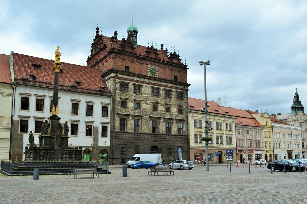 К югу от ратуши начинается Площадь Республики (кое-где пишут, что это одна из крупнейших городских площадей Европы), главная звезда которой - высочайший в Чехии Собор Св. Варфоломея с его 102-метровым шпилем (1).