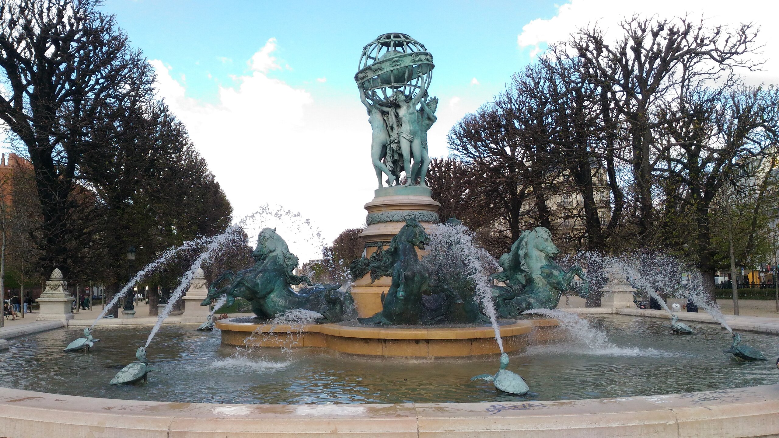 В сквере находится очень красивый фонтан "4 стороны Света", посвященный Марко Поло и Роберту Кавелье де ля Салль. Зимой я уже видела  этот фонтан, но тогда он не действовал. И вот сегодня я вижу его во всей красе.