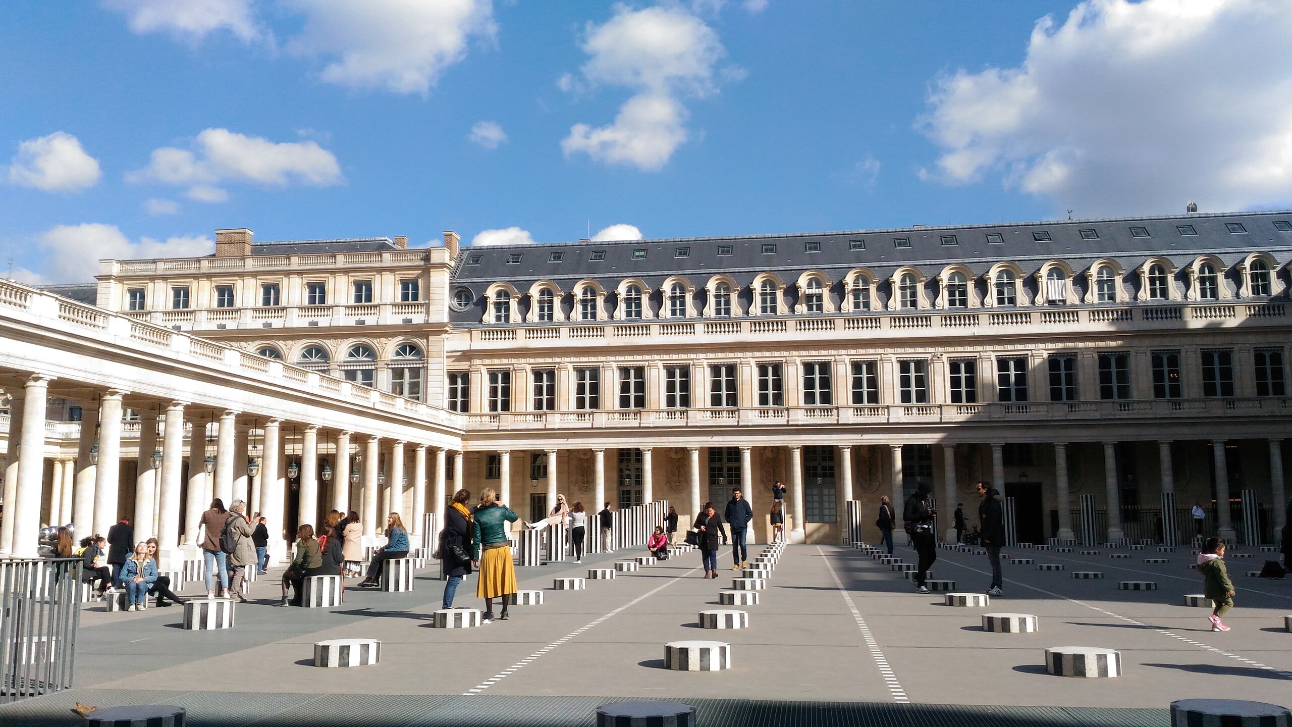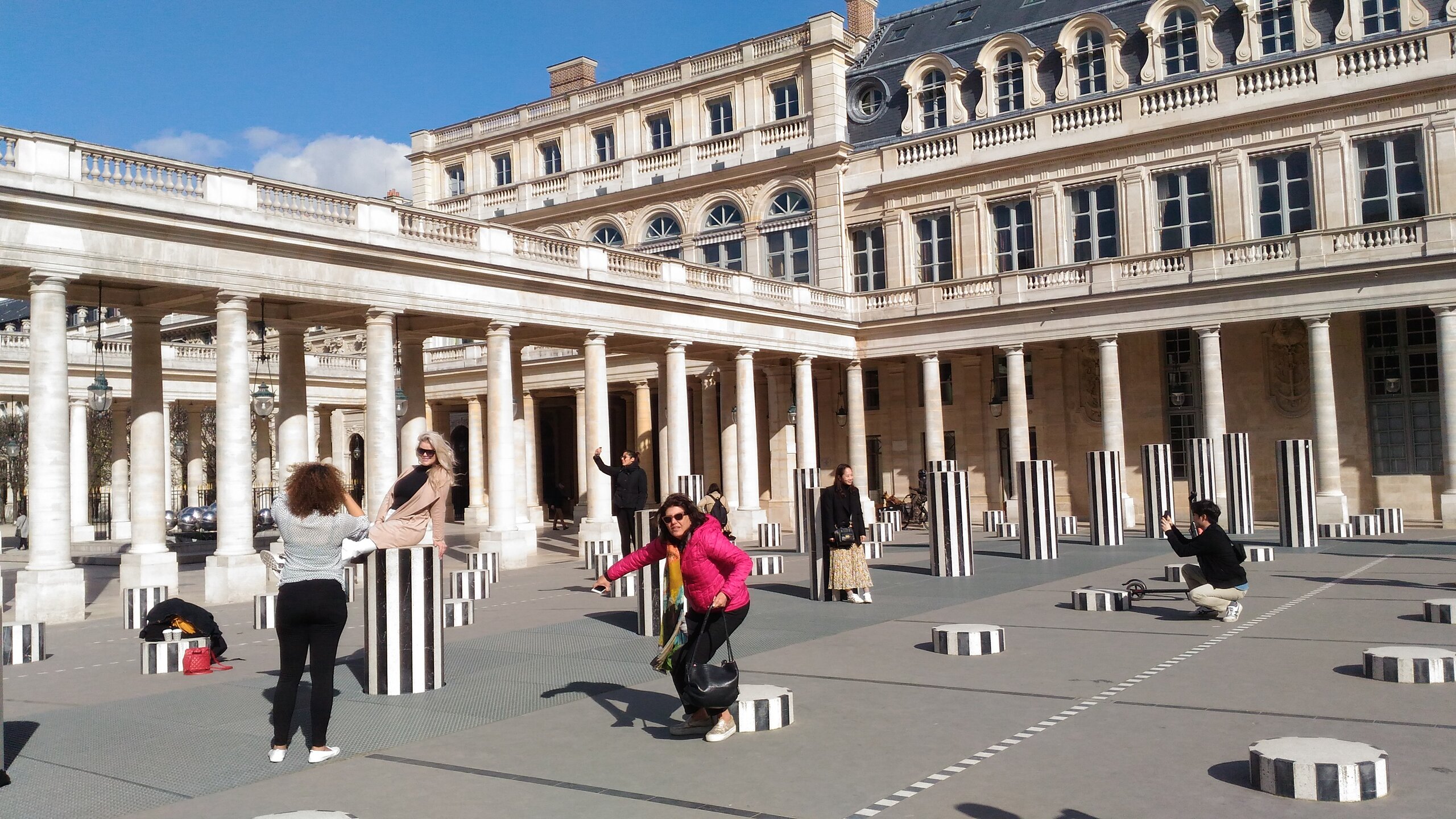 Но сначала, так как я рядом с площадью Колетт, я решаю зайти во двор знаменитого Пале-Руаяль и погулять по симпатичному саду Пале-Руаяль. В главном дворе Пале-Руаяль установлены черно-белые полосатые колонны Даниэля Бюрена разной высоты. Эти необычные колонны появились во дворе Пале-Руаяль в 1986 году после того, как отсюда убрали парковку для машин. Во дворе как всегда много народа. Туристы развлекаются, проводя фото сессию с колоннами.