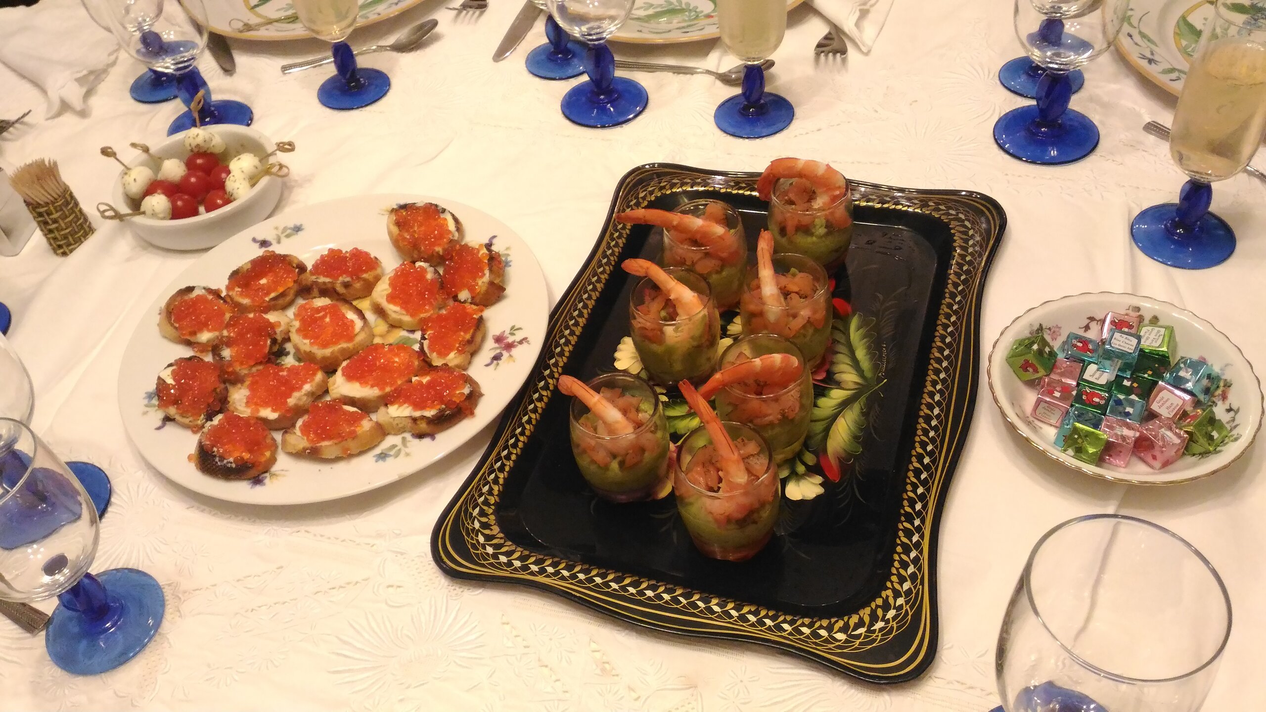 И начинается наше знаменитое французское застолье! На аперитив у нас шампанское и королевский кир (на основе шампанского) и разные закусочки, включая нашу красную икру, которую мои французские друзья очень любят (это мой вклад в застолье вместе с бутылкой великолепного шабли). Я же знала, что основное блюдо - это морепродукты, а шабли к ним превосходно подходит!