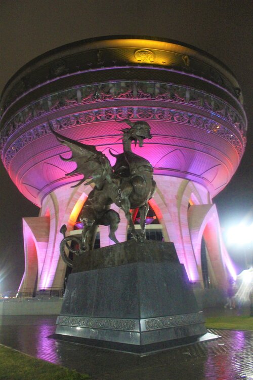 Опубликовано 28 октября, 20205 г. Автор comment_835234 "Огни Казани". И завершает сегодняшний день автобусно-пешеходная экскурсия по ночной Казани. Делаем первую остановку у стен Казанского кремля. Мечеть Кул-Шариф, пожалуй самый красивый туристический объект, с мощной подсветкой. Переезжаем на противоположный берег реки Казанка и делаем остановку у чаши Центра семьи "Казан". Чашу охраняют зиланты (драконы). От Центра семьи "Казан" прекрасно виден Казанский кремль, и для этого не обязательно подниматься на 32-метровую смотровую площадку "Казана". Проехав по правому берегу реки Казанка, мы увидели многие спортивные объекты, хоккейный дворец, футбольную Казань-Арену. Возвращались через мост "Миллениум", остановались у парка имени Горького посмотреть на шоу поющих фонтанов. Следующей остановкой стал театр кукол Экият. Я уже рассказывал вам об этом чудесном здании во время дневной экскурсии. Мечеть "Ирек" будет поменьше, чем Кул-Шариф. Но ночная подсветка у нее такая же мощная. А прямо напротив нее православная церковь святой Евдокии. Тут же один из домов элитного жилого комплекса. И буквально , пройдя метров 300, перед нами во всей красе - Дворец земледельцев. Кул-Шариф и Благовещенский собор мирно соседствуют в Кремле. Экскурсия завершилась. Осталось пройти по пешеходной улице Баумана к своему отелю. Заканчивается пешеходная улица Баумана площадью Тукая. Напротив, через дорогу торговый центр Кольцо, а за ним гранд-отель Казань. Что там на часах Баумана? Ну что, на сегодня хватит прогулок, уже 15 часов на ногах. Завтра у меня поездка в Йошкар-Олу, но до поездки и после нее мы еще немало увидим интересного в Казани. Жалоба