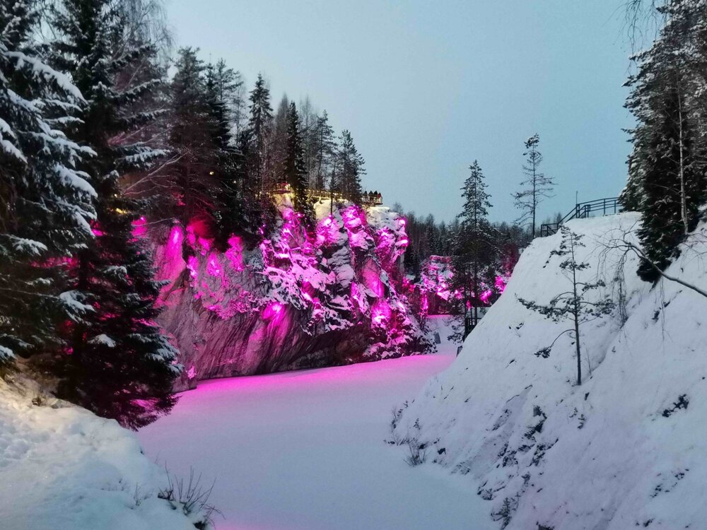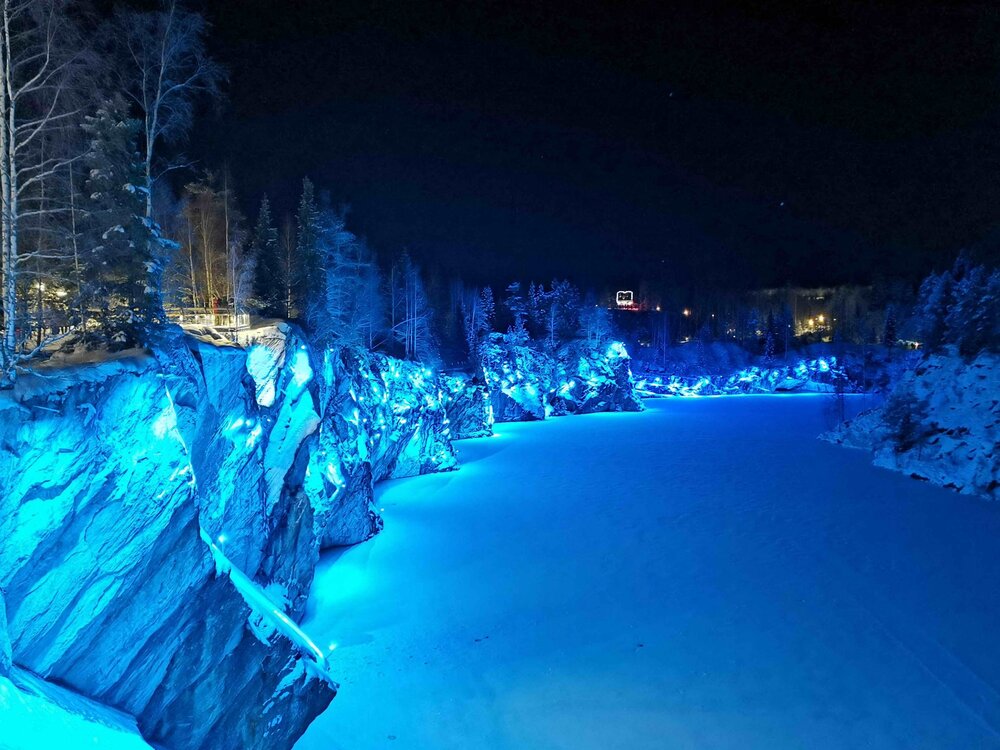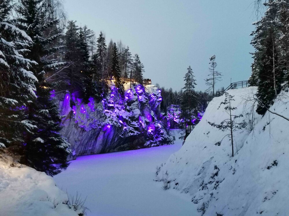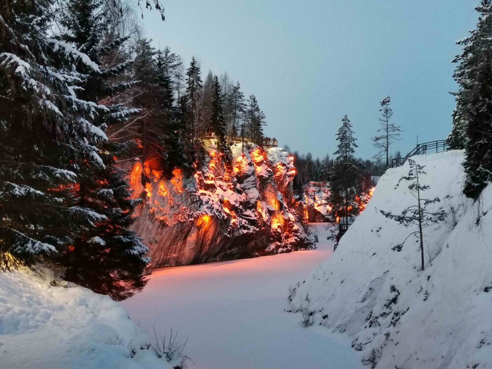 Опубликовано 1 февраля, 20214 г. Автор comment_841108 Дорога от водопадов до парка занимает примерно 10 минут, и уже в 16.40 мы были в Рускеала. Когда вернулись в Рускеалу, то увидели, что уже включили подсветку Мраморного каньона. Пока его обходили, то стемнело окончательно. Затем решили дойти до Итальянского карьера. До него дошли, но он не был подсвечен. Прошли мимо парка в парке "Тайные тропы земли Калевала" Если по времени - то это примерно 18.00 Поезд Рускеала - Санкт-Петербург у нас был в 19.20, в Санкт-Петербург он прибывает в 23.59. До поезда у нас оставалось еще немного времени и мы зашли в кафе "Лето", чтобы выпить чай и перекусить калитками. Только на выходе из парка, уже рядом с поездом, я сфотографировала кассы в парк у жд станции. Красивая зимняя сказка закончилась. Жалоба