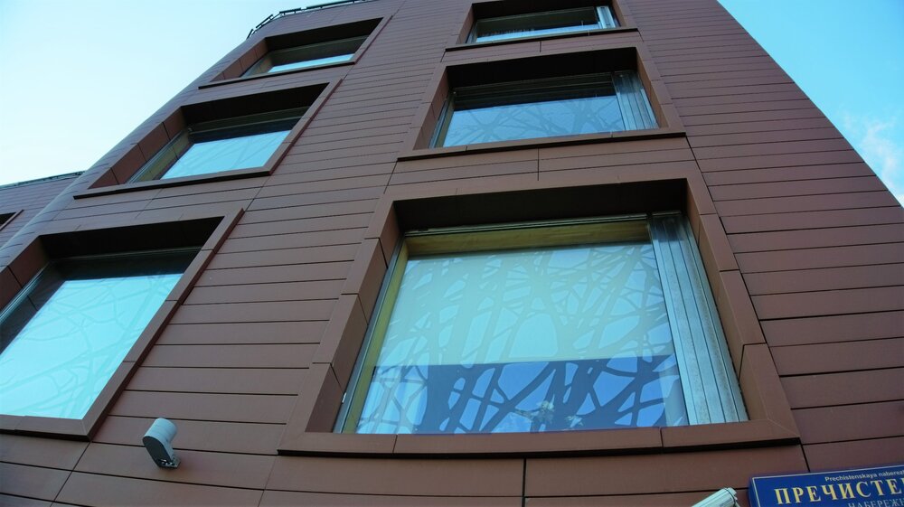 На окнах- не отражение деревьев, это нанесено специальное покрытие, создаётся впечатление, что это ветви, на самом деле и деревья-то слишком далеко, чтобы отражаться.