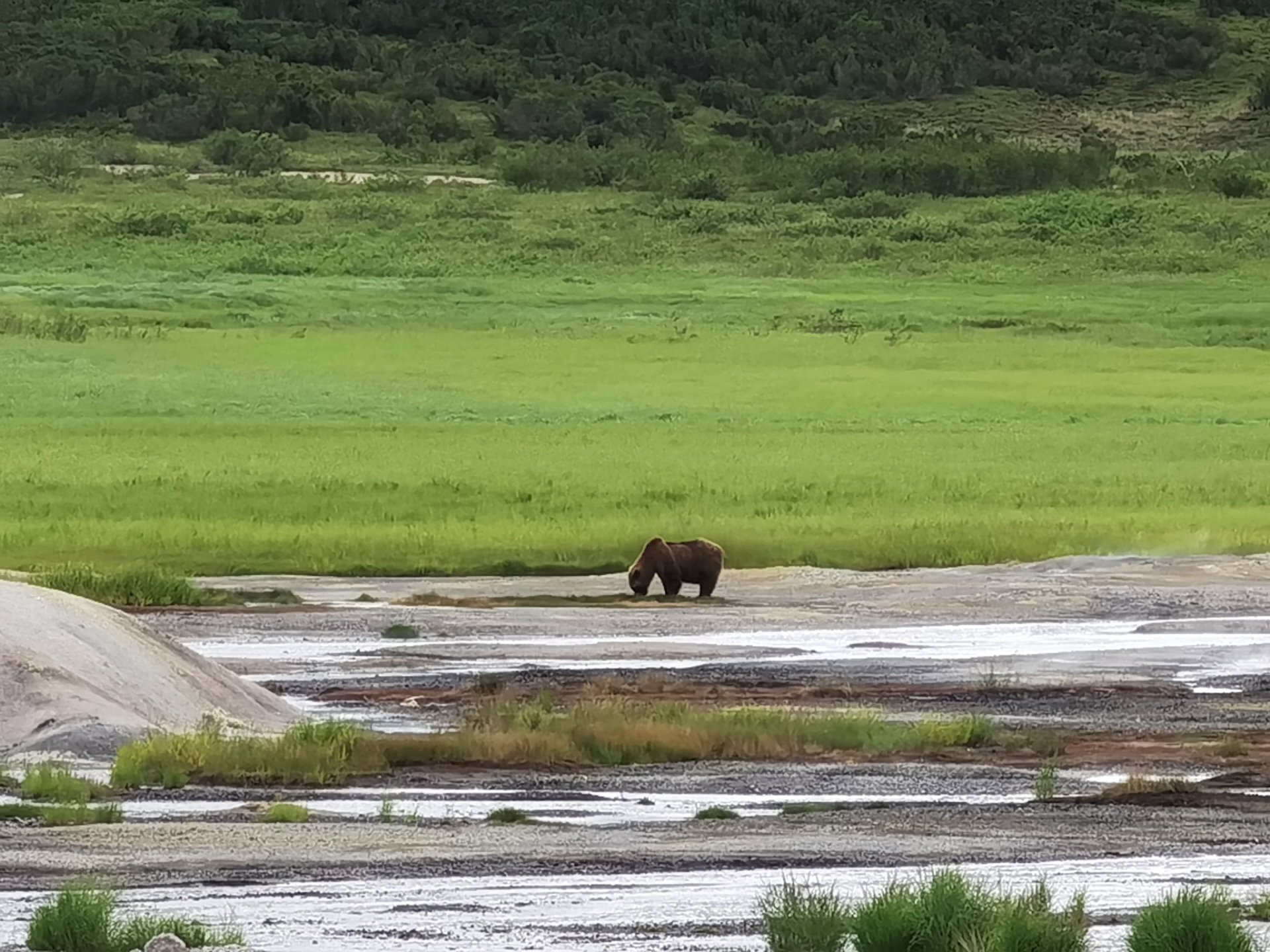 Опубликовано 30 июля, 20214 г. Автор comment_852745 Итак, первой высадкой у нас была экскурсия по кальдере вулкана Узон. Здесь я встретила первого мишку, свободно гуляющего по тропам Жалоба