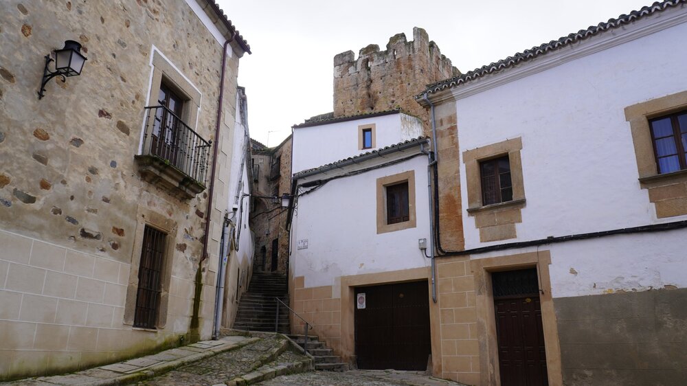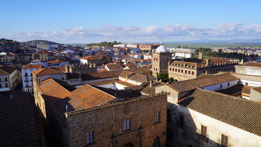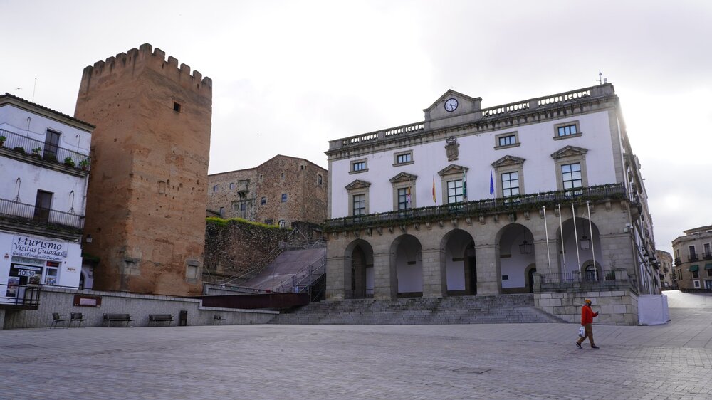И доехали мы до испанского города Касерес, который отчасти повторил судьбу португальской Иданьи, только с более резкими зигзагами взлётов и падений. Он также был основан римлянами в конце первого века до нашей эры и стал небольшим, но важным пунктом на римской дороге, связывающей столицу провинции Мериду с севером Испании. Во время вторжения вестготов городок забросили, а завоеватели-арабы через пару веков его снова восстановили. После отвоевания Касереса кастильцами он стал важным военным и сельскохозяйственным центром, снова, как и в прежние времена маленьким и богатым, когда и был застроен каменными дворцами местной знати. Но сельское хозяйство Испании пришло в упадок и город вместе с ним, что и законсервировало его позднесредневековый облик. Город настолько обезлюдел, что фактически перестал считать им считаться и повторно был повышен до статуса города аж в 1882 году. Сейчас это довольно крупный город, более ста тысяч человек, живущий образованием, чиновниками и туристами - здесь теперь есть свой университет и размещены многие органы управления регионом.