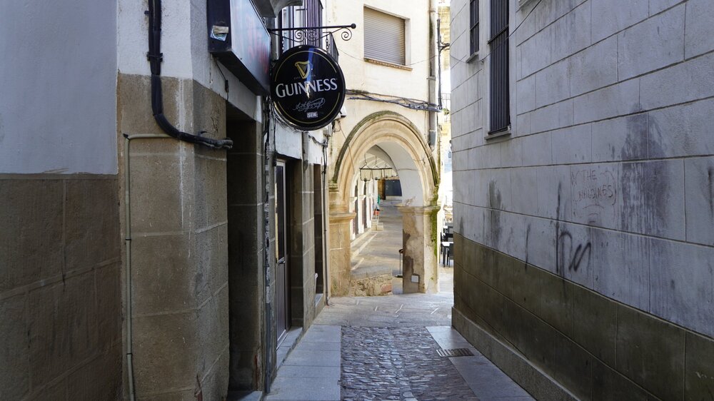 И у Касереса есть одно неоспоримое преимущество - он ровный, здесь почти нет лестниц и крутых подъемов))) Но есть и минус, город всё же крупный, жизнь кипит, поэтому бесплатных парковок в центре нет. Мы нашли паркинг на оживленной улице прямо рядом с центром, загнали туда машину, взяли талончик - всё как и в наших паркингах - и пошли гулять. Времени на прогулку не много, к сожалению, но часа два-два с половиной выкроим. Чем дальше мы заходим в старую часть города, тем меньше народу, магазины все закрыты, вроде как на сиесту, но когда мы шли обратно они так и не открылись, закрыто вообще всё.
