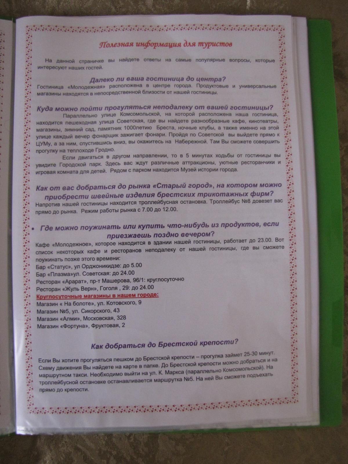 Опубликовано 21 мая, 201411 г. comment_433702 В прошлом году в июле за 3 ночи и два дня в гостинице "Молодежная" Бреста за двоих я заплатила около 5000т.р. русских, курс тогда был 260 бел.руб к 1 рус. Завтраки мы не брали, так как сони были после тура и спали до 11 утра.Рядом по Комсомольской хороший супермаркет, в нем все есть. Рядом через квартал пешеходная красивая Советская улица.До Брестской крепости дошли пешком. Рядом сгостиницей остановка троллейбусов с маршрутами в новые кварталы Бреста (там большой польский и местный рынок)))). Но это я так к сведению, если время будет))Спасибо за подробную информацию! Вы бронировали заранее через Интернет? Отель находится на пути следования автобуса или Вы добирались от вокзала самостоятельно? Жалоба