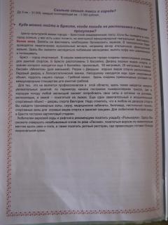 Опубликовано 30 мая, 201411 г. comment_436780 В начале мая(перед поездкой) тема "Где остановиться в Бресте?" была для меня более чем актуальной. Предварительно было забронировано несколько гостиниц(Молодёжная, Веста..)Но в итоге свой выбор остановили на частном секторе (сайт "Квартиры в Бресте по-суточно) и ни сколько не разочаровались: удобно, 10 мин от вокзала, центра, Брестской крепости, гораздо дешевле- 2-х ком современная квартира с мебелью, ТВ, со всеми кухонными принадлежностями, wi-fi,и т.д.) обошлась в 50 $(на две семьи), т.е. 1750руб за сутки.Хотя это считается дорого, т.к. были праздничные дни- 9-10 мая. В обычные дни такая квартира стоит 35-45 дол.сша.Но это всё равно дешевле. чем нам выставили счета гостиницы! И, конечно же, домашний комфорт не сравнить с номером в гостинице.Так что, в дальнейшем, можно смело бронировать квартиры и отдыхать до и после поездки "по-домашнему"! Жалоба